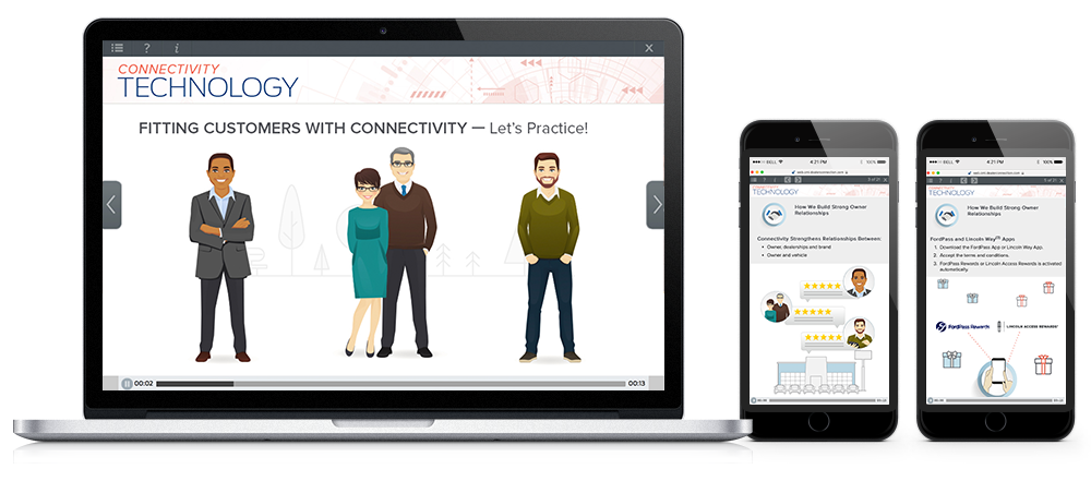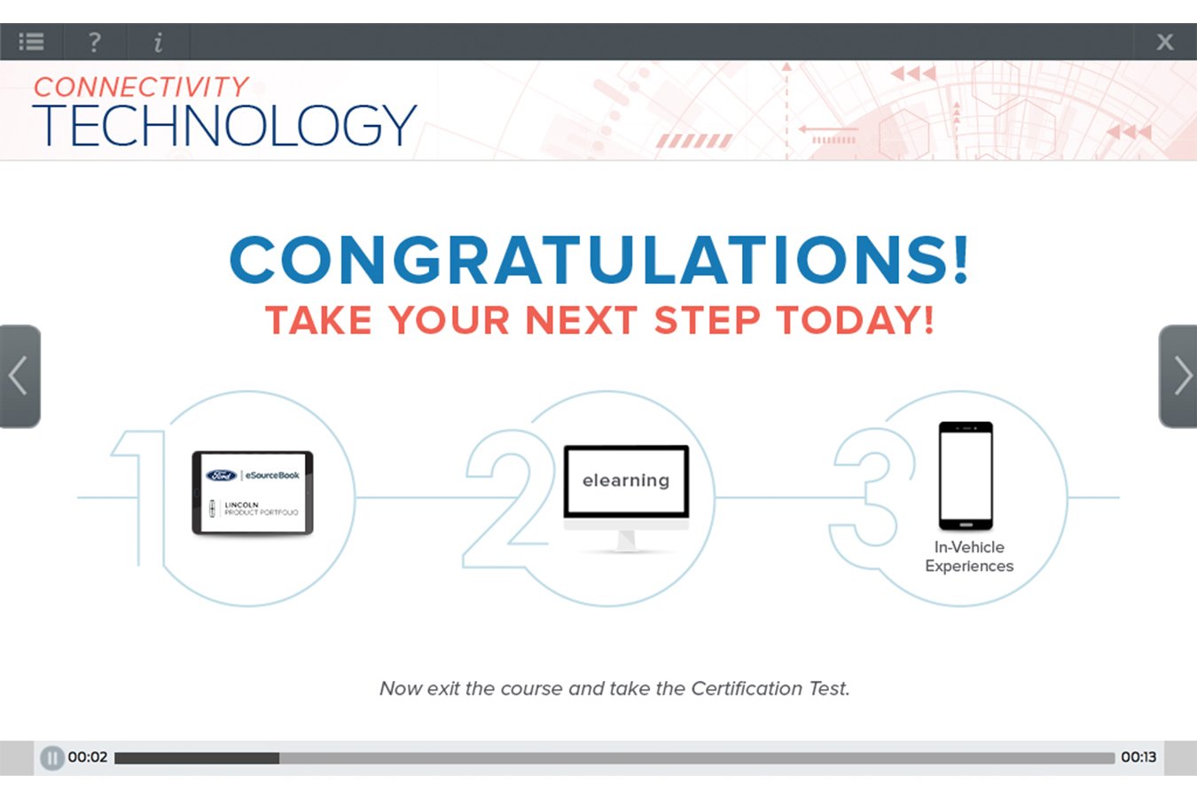 This responsive eLearning course was created to showcase the innovative technologies Ford and Lincoln offer to help customers stay connected.
