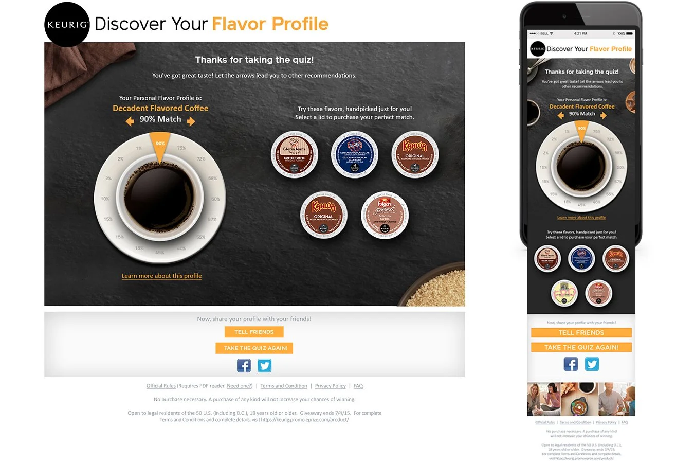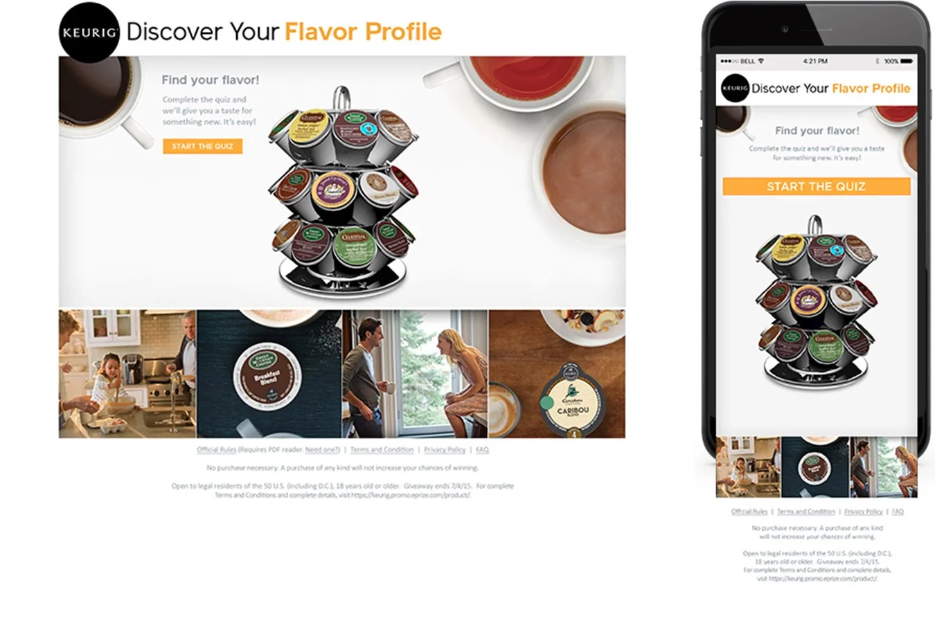 I was the lead designer on Keurig Beverages vibrant microsite and mobile campaign, which featured an engaging personality test that invited users to uncover their unique flavor profiles. As they navigated the experience, they were captivated by an animated Keurig carousel spinning with tantalizing options. After exploring a delightful array of photos, participants embarked on a fun journey to discover their ideal flavor match, making the process both entertaining and personalized.